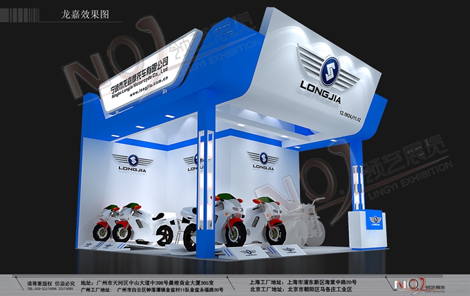 契合龍嘉摩托的品牌形象和產品特性,采用框型結構,再搭配燈具燈光的效果,襯托出展位超前、簡約的氛圍,突出一種融合、個性的時尚品味。