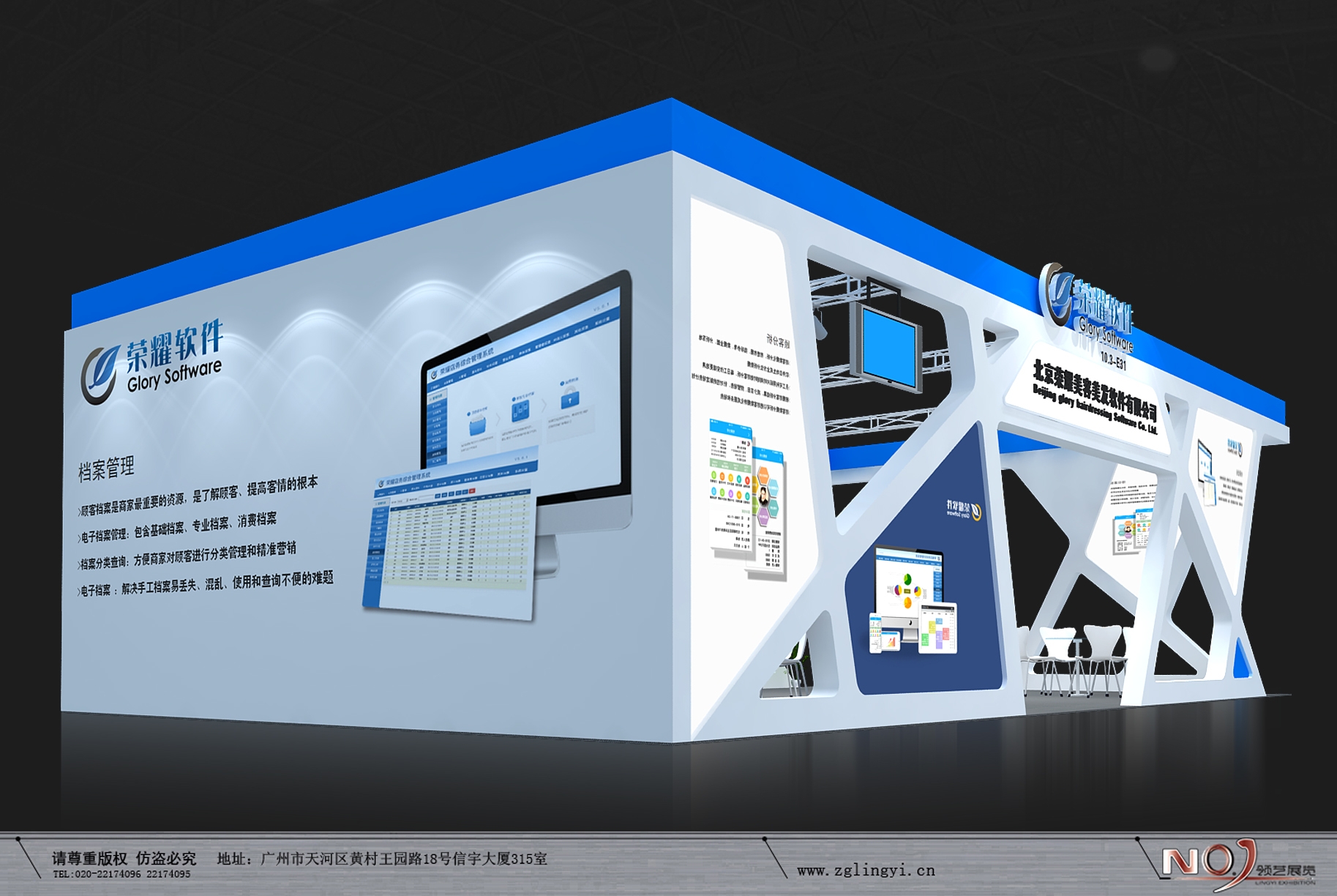 契合榮耀軟件的品牌形象和產(chǎn)品特性,采用線條,再搭配燈具燈光的效果,襯托出展位簡約、舒適的氛圍,突出一種現(xiàn)代、高端的時(shí)尚品味。