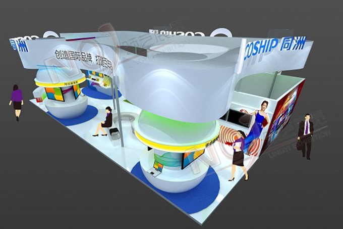 契合同洲電子的品牌形象和產(chǎn)品特性,采用曲線、框型結構,再搭配燈具燈光的效果,襯托出展位休閑、舒適的氛圍,突出一種躍動、簡約的時尚品味。