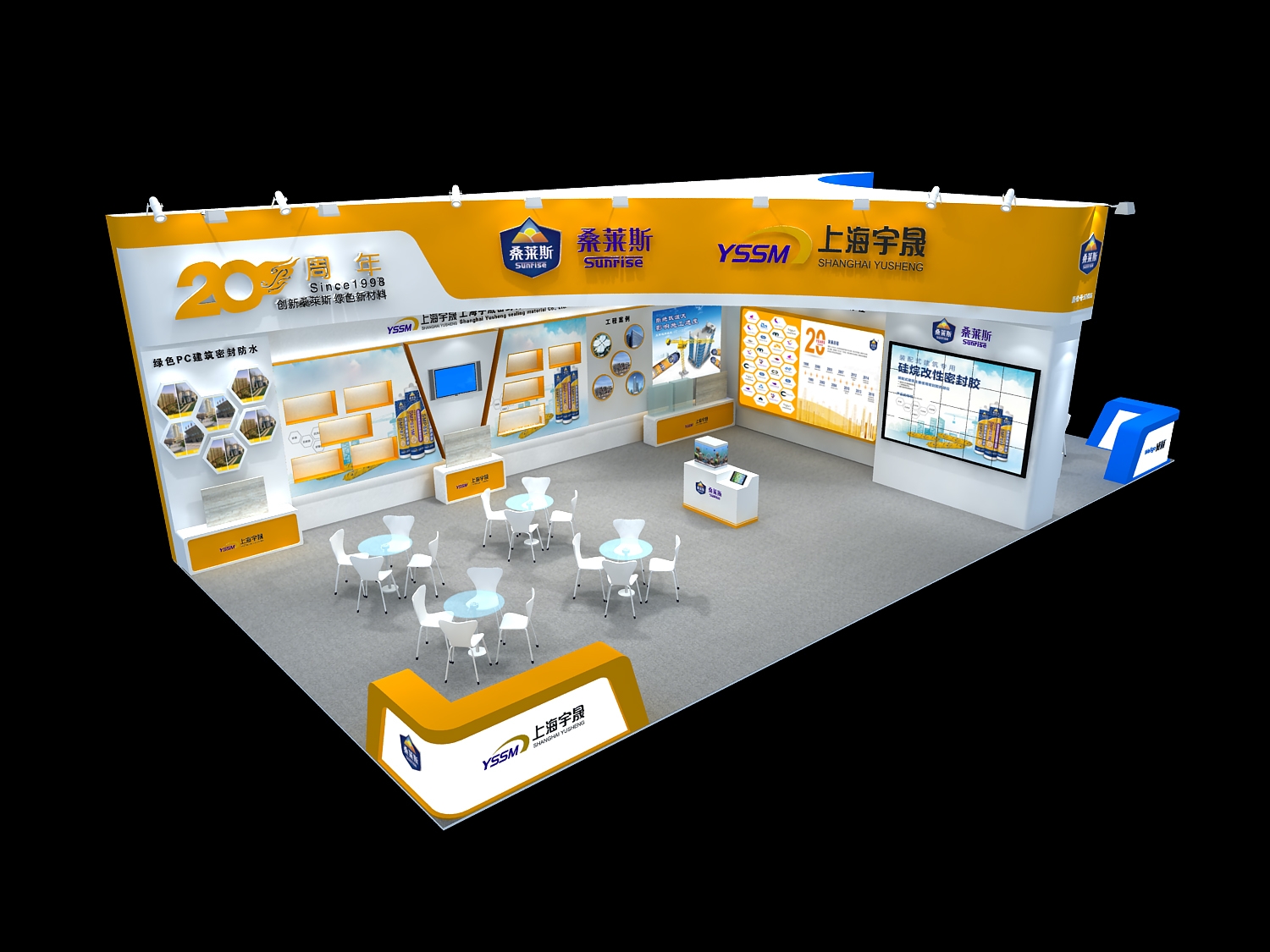 契合上海宇晟的品牌形象和產(chǎn)品特性,采用開放式的造型,再搭配燈具燈光的效果,襯托出展位現(xiàn)代、清新氛圍,突出一種現(xiàn)代、高端的時(shí)尚品味。