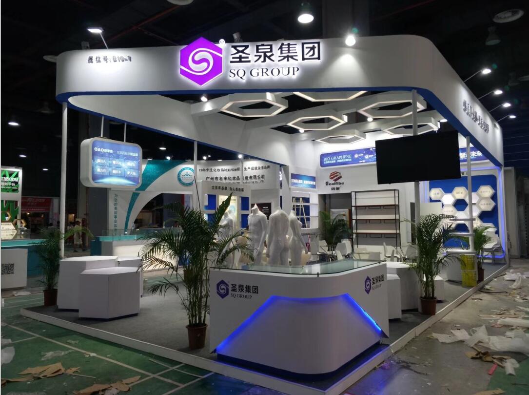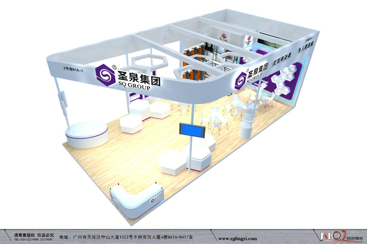 契合山東圣泉品牌形象和產(chǎn)品特性,利用天花造型,再搭配燈具燈光的效果,襯托出展位現(xiàn)代、突出一種現(xiàn)代、高端的時尚品味。