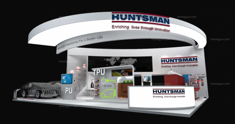 契合亨斯邁的品牌形象和產(chǎn)品特性,采用曲線、框型結(jié)構(gòu),再搭配燈具燈光的效果,襯托出展位簡(jiǎn)約、融合的氛圍,突出一種高端、舒適的時(shí)尚品味。