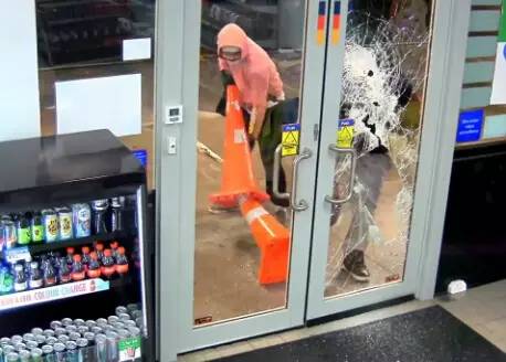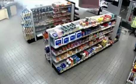 監(jiān)控錄像記錄了事發(fā)的整個過程:一開始,兩個帶著作案工具的蒙面盜賊在用力敲擊加油站內(nèi)商店的玻璃門,動作十分兇狠。就在他們將要從被砸破的門洞中鉆進室內(nèi)時,商店的一角開始噴發(fā)白色煙霧(仔細看下圖左上角)。