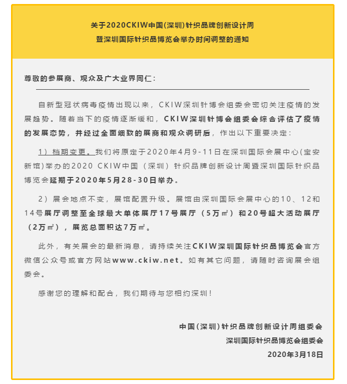 根據(jù)針博會(huì)設(shè)計(jì)搭建公司領(lǐng)藝展覽了解到,原定于2020年4月9-11日在深圳國(guó)際會(huì)展中心(寶安新館)舉辦的2020 CKIW中國(guó)(深圳)針織品牌創(chuàng)新設(shè)計(jì)周暨深圳國(guó)際針織品博覽會(huì)延期于2020年5月28-30日舉辦。如需針博會(huì)展會(huì)設(shè)計(jì)請(qǐng)聯(lián)系領(lǐng)藝展覽,希望我們能在針博會(huì)搭建上為您添磚加瓦,祝各位朋友收獲多多,滿載而歸!