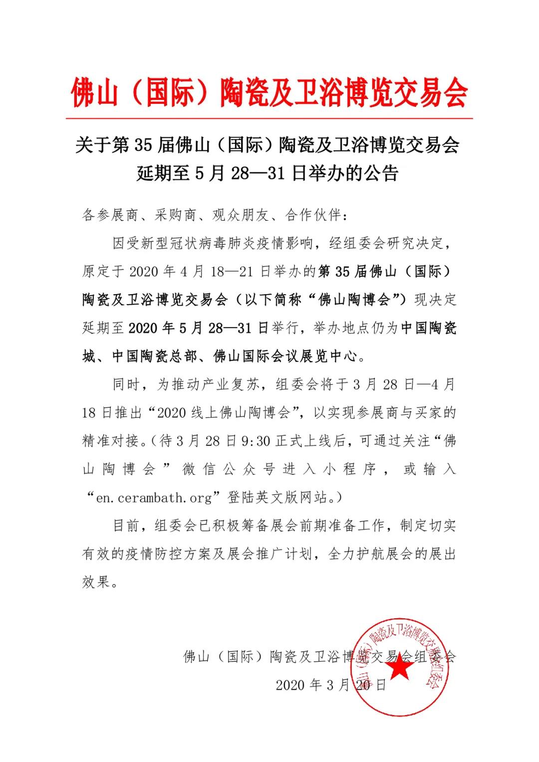 根據(jù)陶博會(huì)陶瓷展設(shè)計(jì)搭建公司領(lǐng)藝展覽了解到,受新型冠狀病毒疫情防控影響。為全力做好新型冠狀病毒感染肺炎疫情防控工作,為了響應(yīng)及配合疫情防控工作,確保各參展商及觀眾的健康安全,陶博會(huì)組委會(huì)決定將原定于2020年4月18-21日舉辦的第35屆佛山(國(guó)際)陶瓷及衛(wèi)浴博覽交易會(huì)將延期至5月28—31日舉辦。如需陶博會(huì)設(shè)計(jì)請(qǐng)聯(lián)系領(lǐng)藝展覽,希望我們能在陶博會(huì)搭建上為您添磚加瓦,祝各位朋友收獲多多,滿載而歸!