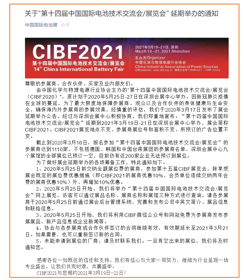 根據(jù)電池展設(shè)計搭建公司領(lǐng)藝展覽了解到,原計劃于2020年5月25日-27日在深圳會展中心舉辦。因新冠肺炎疫情在全球的蔓延,為了最大限度地保障參展商、觀眾以及合作伙伴的身體健康與生命安全,確保海內(nèi)外參展商的參展效果,經(jīng)慎重的評估,我們于2020年3月17日發(fā)布了展會延期舉辦公告。經(jīng)過與深圳會展中心積極協(xié)商,我們鄭重地宣布:“第十四屆中國國際電池技術(shù)交流會/展覽會”延期到2021年3月19日-21日在深圳會展中心舉辦,展會簡稱CIBF2021。如需電池展設(shè)計請聯(lián)系領(lǐng)藝展覽,希望我們能在電池展搭建上為您添磚加瓦,祝各位朋友收獲多多,滿載而歸!