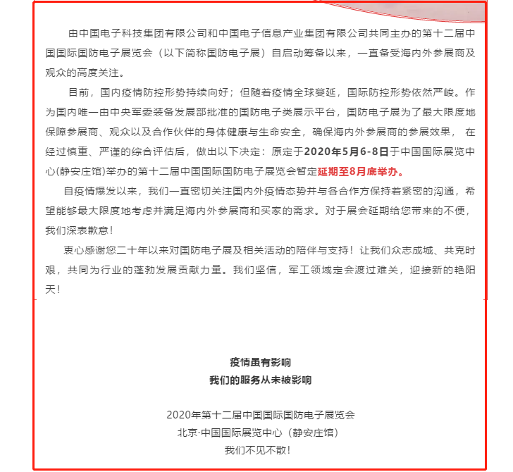 根據(jù)國防電子展設(shè)計(jì)搭建公司領(lǐng)藝展覽了解到,受新冠肺炎疫情影響,原定于2020年5月6-8日于中國國際展覽中心(靜安莊館)舉辦的第十二屆中國國際國防電子展覽會(huì)暫定延期至8月底舉辦。如需國防電子展設(shè)計(jì)請(qǐng)聯(lián)系領(lǐng)藝展覽,希望我們能在國防電子展搭建上為您添磚加瓦,祝各位朋友收獲多多,滿載而歸!