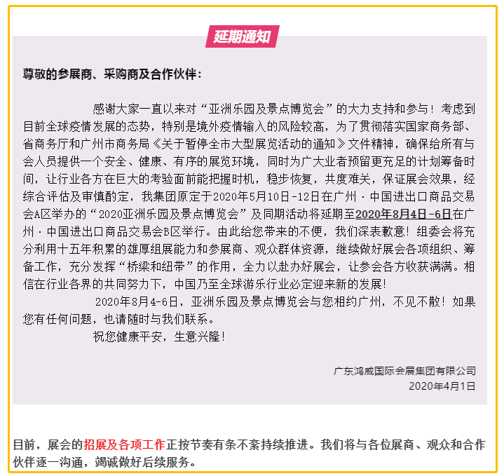 根據(jù)樂園展設(shè)計搭建公司領(lǐng)藝展覽了解到,受新冠肺炎疫情影響,原定于2020年5月10日-12日在廣州·中國進出口商品交易會A區(qū)舉辦的“2020亞洲樂園及景點博覽會”及同期活動將延期至2020年8月4日-6日在廣州·中國進出口商品交易會B區(qū)舉行。如需樂園展設(shè)計請聯(lián)系領(lǐng)藝展覽,希望我們能在樂園展搭建上為您添磚加瓦,祝各位朋友收獲多多,滿載而歸!