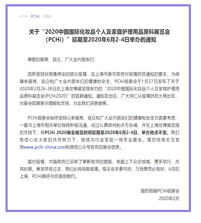 根據(jù)上海家庭護理展設(shè)計搭建公司領(lǐng)藝展覽了解到,因新型冠狀病毒感染的肺炎疫情,應(yīng)上海市委市政府對疫情防控通知的要求,為保障參展商、觀眾和廣大業(yè)內(nèi)朋友們的健康和安全,PCHi組委會于1月27日發(fā)布了關(guān)于2020年2月26-28日在上海世博展覽館舉辦的“2020中國國際化妝品個人及家庭護理用品原料展覽會(PCHi2020)”的延期通知。將PCHi 2020展會展覽時間延期至2020年6月2-4日,舉辦地點不變。我們將繼續(xù)密切關(guān)注展會動態(tài),希望我們能在上海家庭護理展搭建上為您添磚加瓦,祝各位朋友收獲多多,滿載而歸!嚴寒終將過去,春天必將來臨。上海家庭護理展設(shè)計搭建公司領(lǐng)藝展覽向抗疫一線的所有英雄致敬!