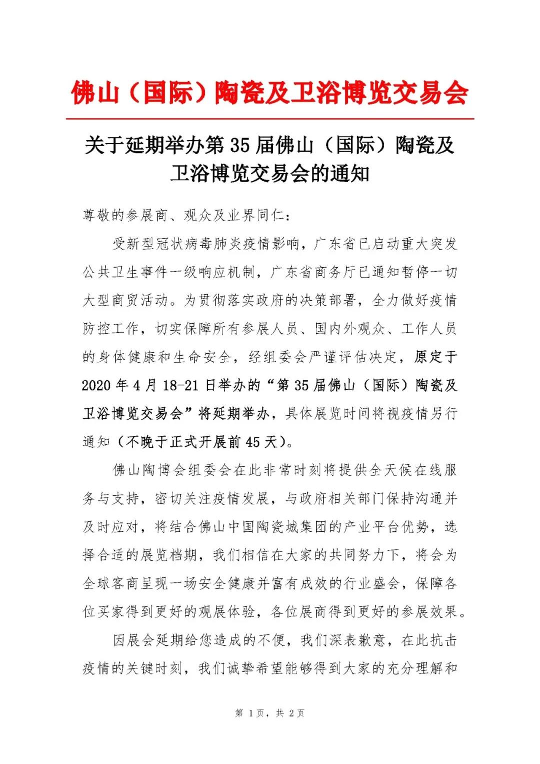 根據(jù)陶博會(huì)陶瓷展設(shè)計(jì)搭建公司領(lǐng)藝展覽了解到,受新型冠狀病毒疫情防控影響。為全力做好新型冠狀病毒感染肺炎疫情防控工作,為了響應(yīng)及配合疫情防控工作,確保各參展商及觀眾的健康安全,陶博會(huì)組委會(huì)決定將原定于2020年4月18-21日舉辦的第35屆佛山(國(guó)際)陶瓷及衛(wèi)浴博覽交易會(huì)將延期舉辦。有關(guān)展會(huì)的最新消息,請(qǐng)關(guān)注展會(huì)官網(wǎng):www.cerambath.org。如需陶博會(huì)設(shè)計(jì)請(qǐng)聯(lián)系領(lǐng)藝展覽,希望我們能在陶博會(huì)搭建上為您添磚加瓦,祝各位朋友收獲多多,滿載而歸!