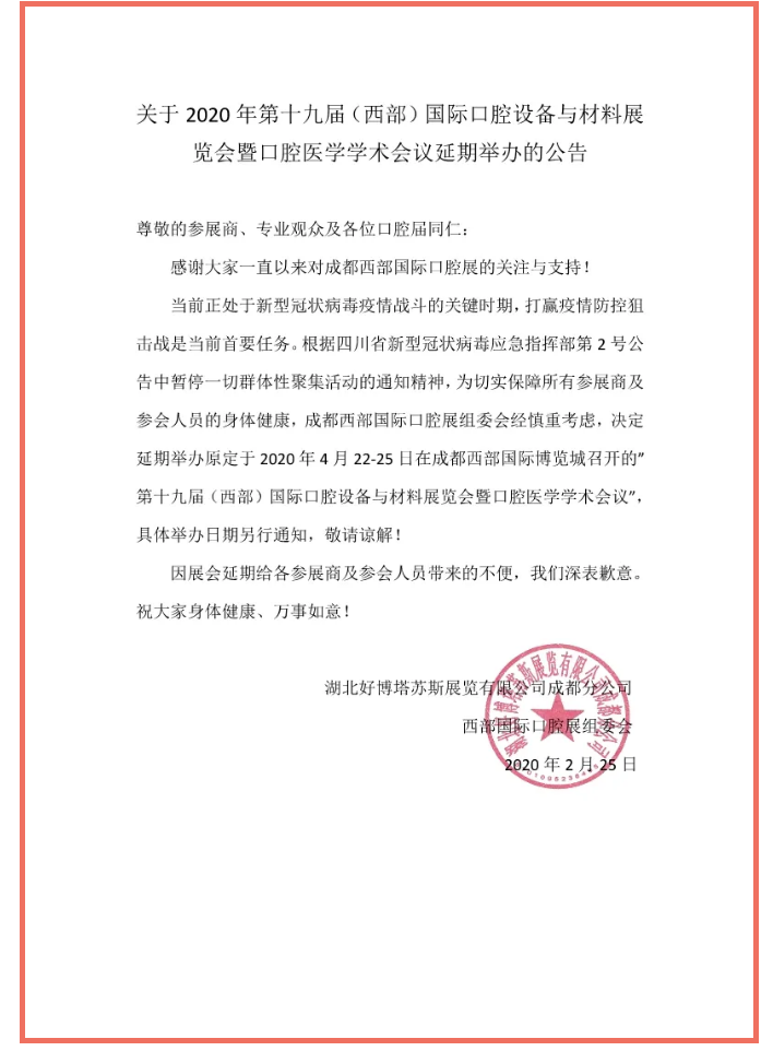 根據(jù)成都西部國際口腔展設(shè)計搭建公司領(lǐng)藝展覽了解到,當(dāng)前正處于新型冠狀病毒疫情戰(zhàn)斗的關(guān)鍵時期,打贏疫情防控狙擊戰(zhàn)是當(dāng)前首要任務(wù)。根據(jù)四川省新型冠狀病毒應(yīng)急指揮部第2號公告中暫停一切群體性聚集活動的通知精神,為保障所有參展商及參會人員的安全和健康,成都西部國際口腔展組委會經(jīng)慎重考慮,決定延期舉辦原定于2020年4月22-25日在成都西部國際博覽城召開的“第十九屆(西部)國際口腔設(shè)備與材料展覽會暨口腔醫(yī)學(xué)學(xué)術(shù)會議”,具體舉辦日期另行通知,敬請諒解!如需成都口腔展設(shè)計請聯(lián)系領(lǐng)藝展覽,希望我們能在口腔展搭建上為您添磚加瓦,祝各位朋友收獲多多,滿載而歸!