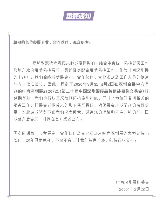 根據(jù)時(shí)尚深圳展設(shè)計(jì)搭建公司領(lǐng)藝展覽了解到,受新型冠狀病毒感染肺炎疫情影響,結(jié)合中央統(tǒng)一防控部署工作及地方政府疫情防控要求,貫徹落實(shí)配合疫情防控工作,作為時(shí)尚深圳展的主辦方,我們始終將參展企業(yè)、合作伙伴、專業(yè)觀眾及工作人員的健康與安全放在首位,因此,原定于2020年3月31-4月2日在深圳會(huì)展中心舉辦的時(shí)尚深圳展AW20/21(第二十屆中國(guó)深圳國(guó)際品牌服裝服飾交易會(huì))將延期舉辦,我們也將認(rèn)真采取預(yù)防措施和措施,同時(shí)全力做好各項(xiàng)相關(guān)的服務(wù)工作,把展會(huì)延期帶來(lái)的影響降至最低,確保展會(huì)延期舉辦的商貿(mào)效果。對(duì)此造成諸多不便我們深表歉意,感謝您的理解和關(guān)注,新的舉辦日期確定后會(huì)第一時(shí)間在官方渠道公布。如需時(shí)尚深圳展設(shè)計(jì)請(qǐng)聯(lián)系領(lǐng)藝展覽,希望我們能在時(shí)尚深圳展搭建上為您添磚加瓦,祝各位朋友收獲多多,滿載而歸!