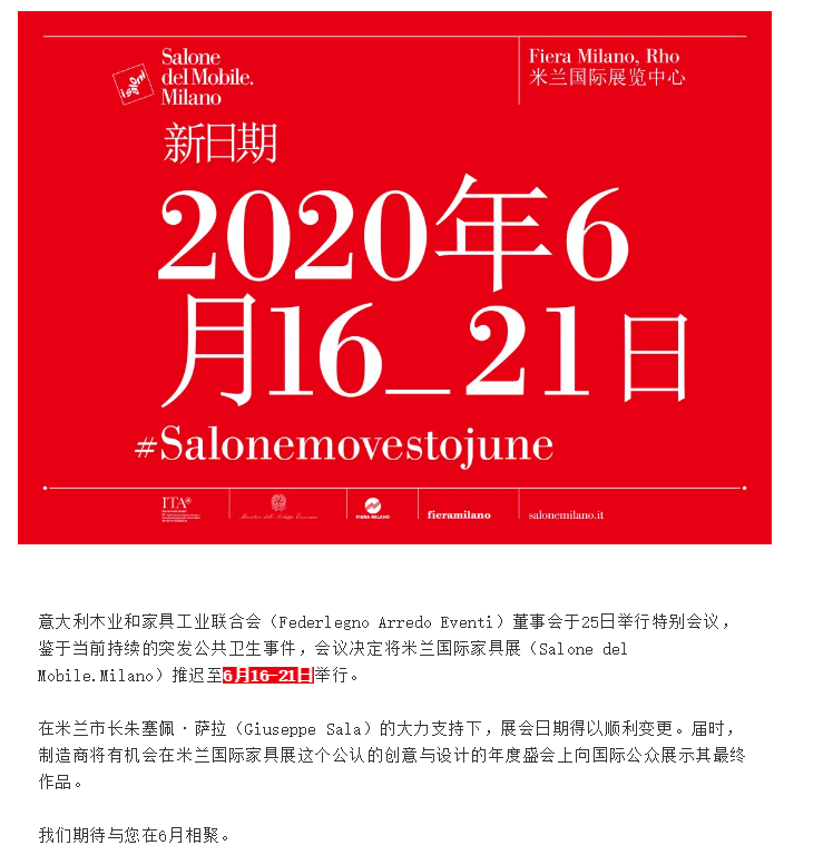 根據(jù)家具展展臺(tái)設(shè)計(jì)公司領(lǐng)藝展覽了解到,意大利木業(yè)和家具工業(yè)聯(lián)合會(huì)(Federlegno Arredo Eventi)董事會(huì)于25日舉行特別會(huì)議,鑒于當(dāng)前持續(xù)的突發(fā)公共衛(wèi)生事件,會(huì)議決定將米蘭國際家具展(Salone del Mobile.Milano)推遲至6月16-21日舉行。在米蘭市長朱塞佩·薩拉(Giuseppe Sala)的大力支持下,展會(huì)日期得以順利變更。屆時(shí),制造商將有機(jī)會(huì)在米蘭國際家具展這個(gè)公認(rèn)的創(chuàng)意與設(shè)計(jì)的年度盛會(huì)上向國際公眾展示其最終作品。如需家具展展位設(shè)計(jì)裝修請(qǐng)聯(lián)系領(lǐng)藝展覽,希望我們能在家具展布展搭建上為您添磚加瓦,祝各位朋友收獲多多,滿載而歸!