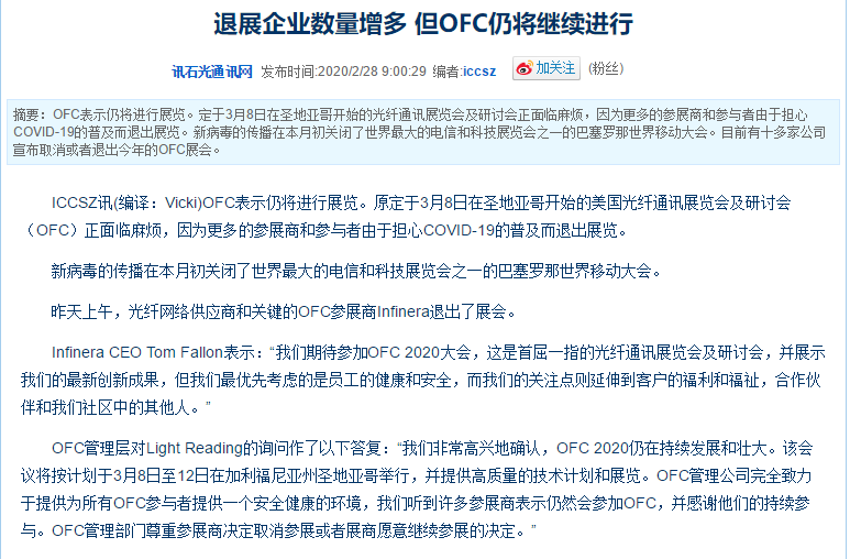根據(jù)光纖通訊展設(shè)計(jì)搭建公司領(lǐng)藝展覽了解到,Infinera CEO Tom Fallon表示:“我們期待參加OFC 2020大會(huì),這是首屈一指的光網(wǎng)絡(luò)會(huì)議,并展示我們的最新創(chuàng)新成果,但我們最優(yōu)先考慮的是員工的健康和安全,而我們的關(guān)注點(diǎn)則延伸到客戶的福利和福祉,合作伙伴和我們社區(qū)中的其他人?!監(jiān)FC管理層對(duì)Light Reading的詢問(wèn)作了以下答復(fù):“我們非常高興地確認(rèn),OFC 2020仍在持續(xù)發(fā)展和壯大。該會(huì)議將按計(jì)劃于3月8日至12日在加利福尼亞州圣地亞哥舉行,并提供高質(zhì)量的技術(shù)計(jì)劃和展覽。OFC管理公司完全致力于提供為所有OFC參與者提供一個(gè)安全健康的環(huán)境,我們聽(tīng)到許多參展商表示仍然會(huì)參加OFC,并感謝他們的持續(xù)參與。OFC管理部門尊重參展商決定取消參展并愿意合作的決定?!比缧?a href="http://www.mjkzs.com/tezhuanganli.html" target="_blank">光纖通訊展設(shè)計(jì)請(qǐng)聯(lián)系領(lǐng)藝展覽,希望我們能在光纖通訊展搭建上為您添磚加瓦,祝各位朋友收獲多多,滿載而歸!