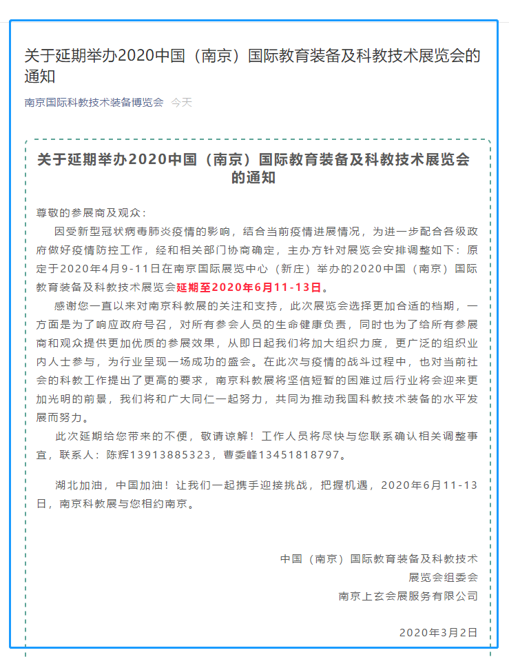 根據(jù)教育展設(shè)計(jì)搭建公司領(lǐng)藝展覽了解到,因受新型冠狀病毒肺炎疫情的影響,結(jié)合當(dāng)前疫情進(jìn)展情況,為進(jìn)一步配合各級(jí)政府做好疫情防控工作,經(jīng)和相關(guān)部門協(xié)商確定,主辦方針對(duì)展覽會(huì)安排調(diào)整如下:原定于2020年4月9-11日在南京國(guó)際展覽中心(新莊)舉辦的2020中國(guó)(南京)國(guó)際教育裝備及科教技術(shù)展覽會(huì)延期至2020年6月11-13日。如需教育展設(shè)計(jì)請(qǐng)聯(lián)系領(lǐng)藝展覽,希望我們能在教育展搭建上為您添磚加瓦,祝各位朋友收獲多多,滿載而歸!