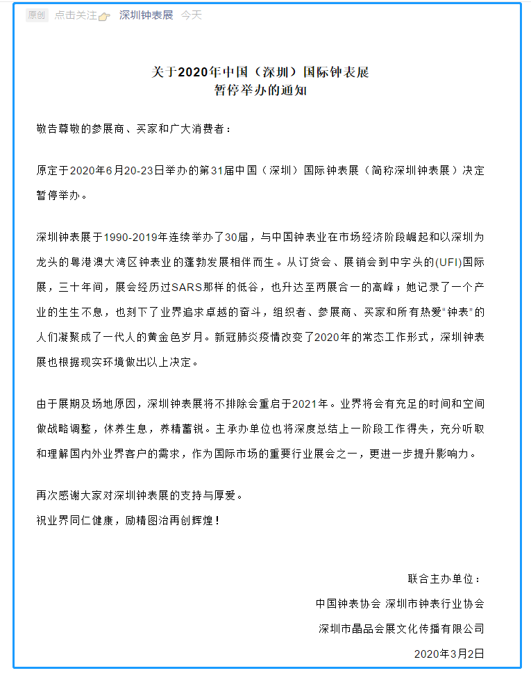 根據(jù)深圳展臺(tái)設(shè)計(jì)搭建公司領(lǐng)藝展覽了解到,原定于2020年6月20-23日舉辦的第31屆中國(深圳)國際鐘表展(簡(jiǎn)稱深圳鐘表展)決定暫停舉辦。如需深圳展臺(tái)設(shè)計(jì)請(qǐng)聯(lián)系領(lǐng)藝展覽,希望我們能在深圳展會(huì)搭建上為您添磚加瓦,祝各位朋友收獲多多,滿載而歸!