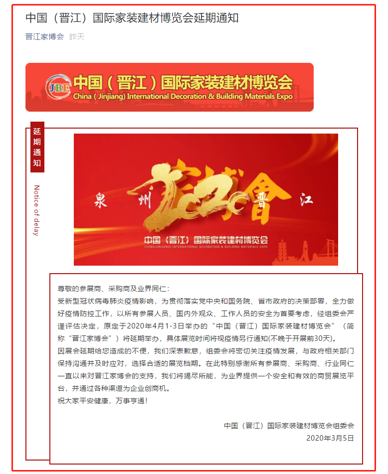 根據(jù)家博會設(shè)計搭建公司領(lǐng)藝展覽了解到,原定于2020年4月1-3日舉辦的“中國(晉江)國際家裝建材博覽會”(簡稱“晉江家博會”)將延期舉辦,具體展覽時間將視疫情另行通知(不晚于開展前30天)。如需家博會展臺設(shè)計請聯(lián)系領(lǐng)藝展覽,希望我們能在家博會展臺搭建上為您添磚加瓦,祝各位朋友收獲多多,滿載而歸!