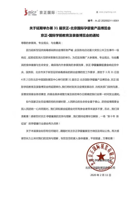 根據(jù)北京孕嬰童展設計搭建公司領藝展覽了解到,原定于2020年3月31日至4月2日在北京中國國際展覽中心舉辦的第31屆京正·北京國際孕嬰童產(chǎn)品博覽會將延期舉辦,具體展覽時間將視疫情另行通知。如需北京孕嬰童展展臺設計請聯(lián)系領藝展覽,希望我們能在北京孕嬰童展展臺搭建上為您添磚加瓦,祝各位朋友收獲多多,滿載而歸!