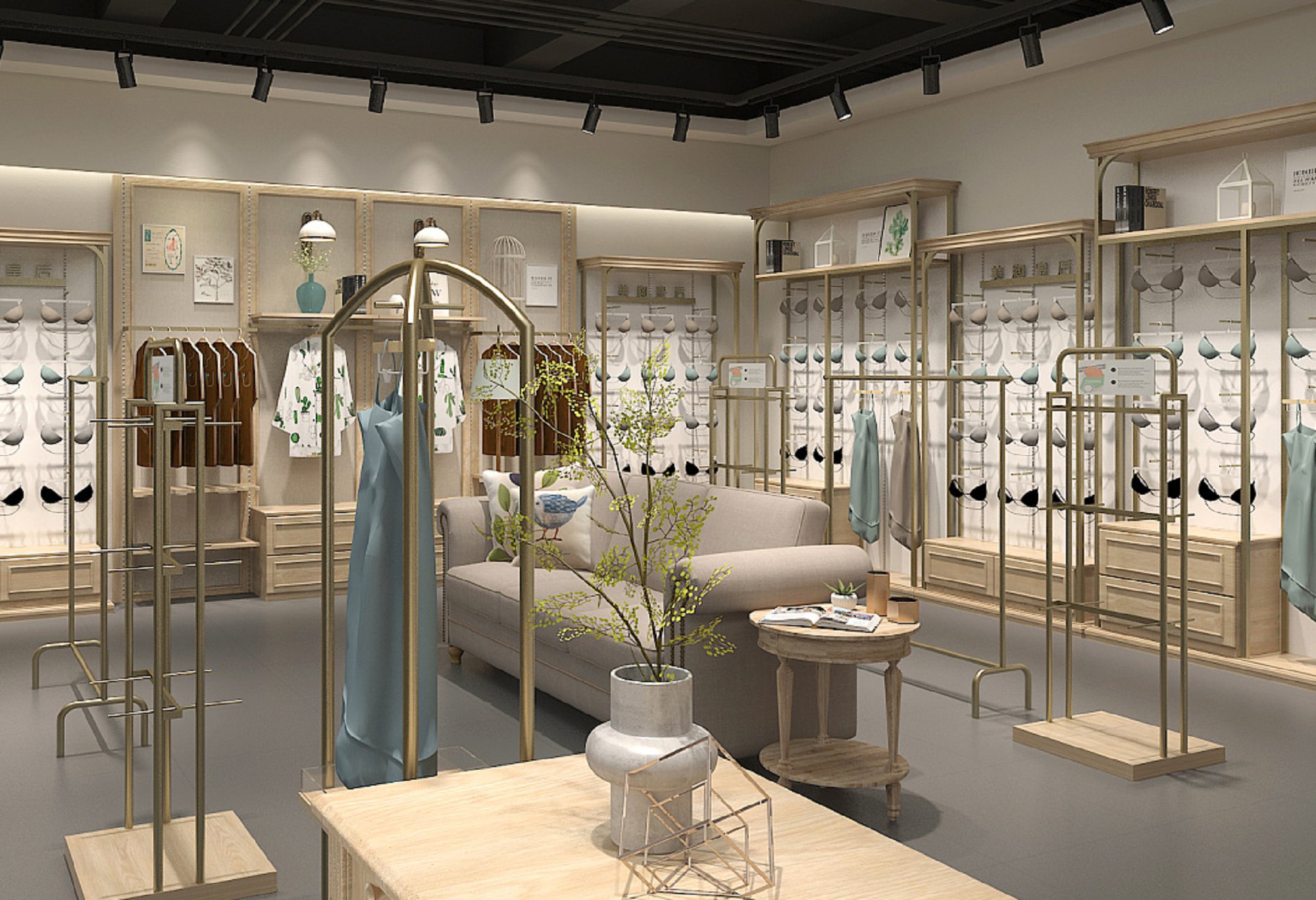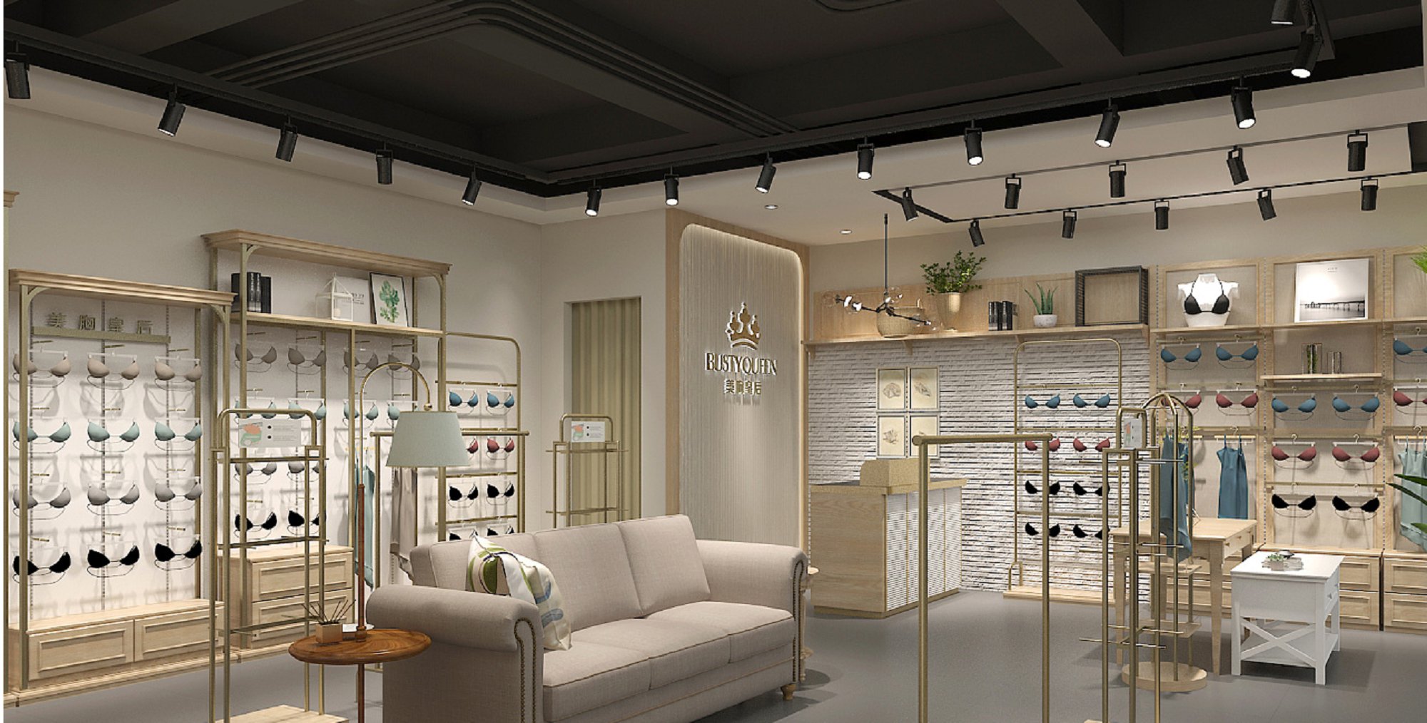 契合美胸皇后的品牌形象和產(chǎn)品特性,采用開放式結構進行合理的分區(qū),再搭配燈具燈光的效果,襯托出專賣店大氣、豪華的氛圍,突出一種簡約、時尚的品味。